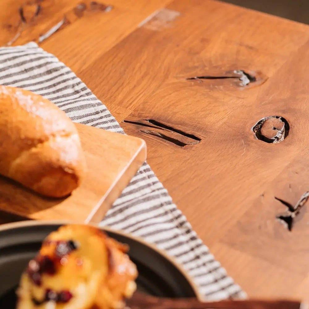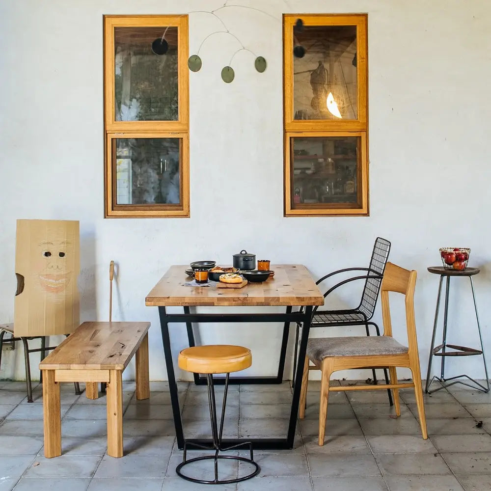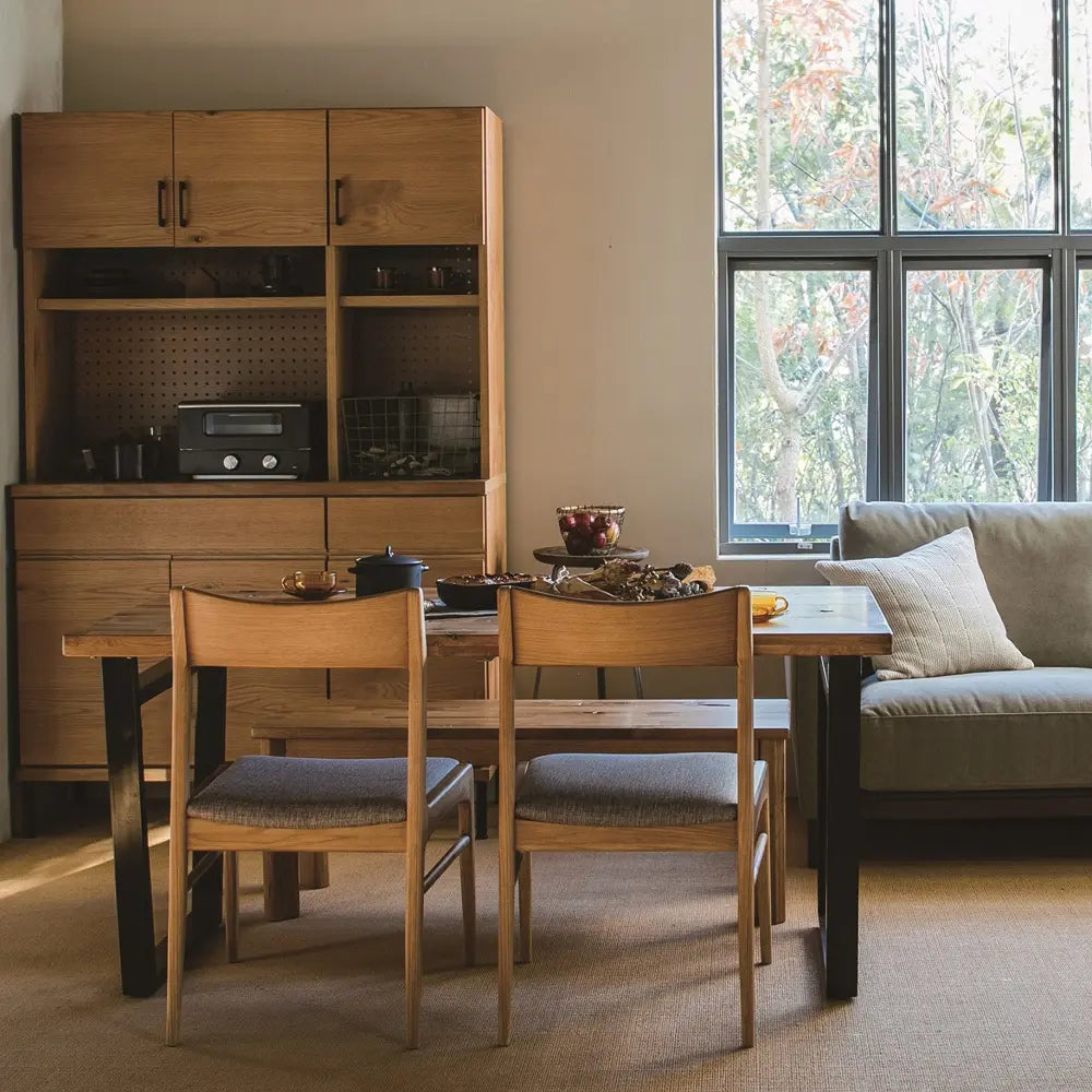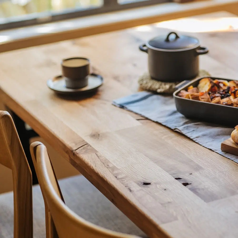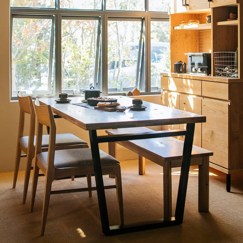 オーク集成材の天板はダメージをあえて残し、経年変化を楽しめる風合いを持っています。