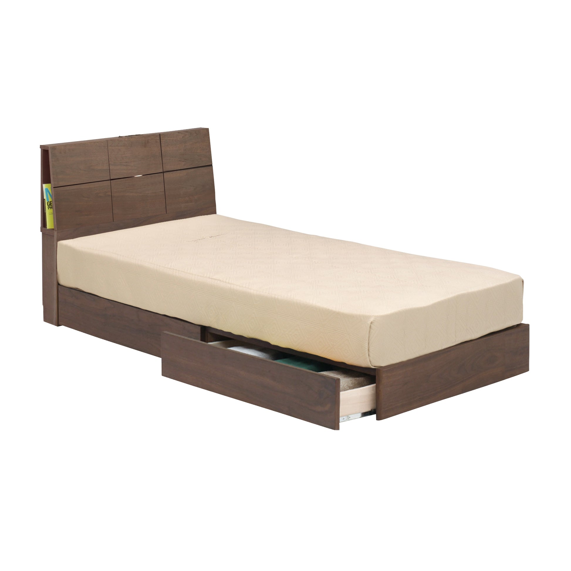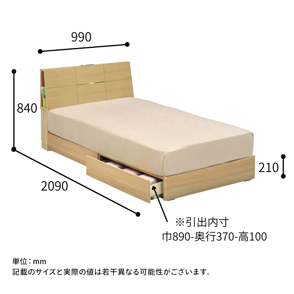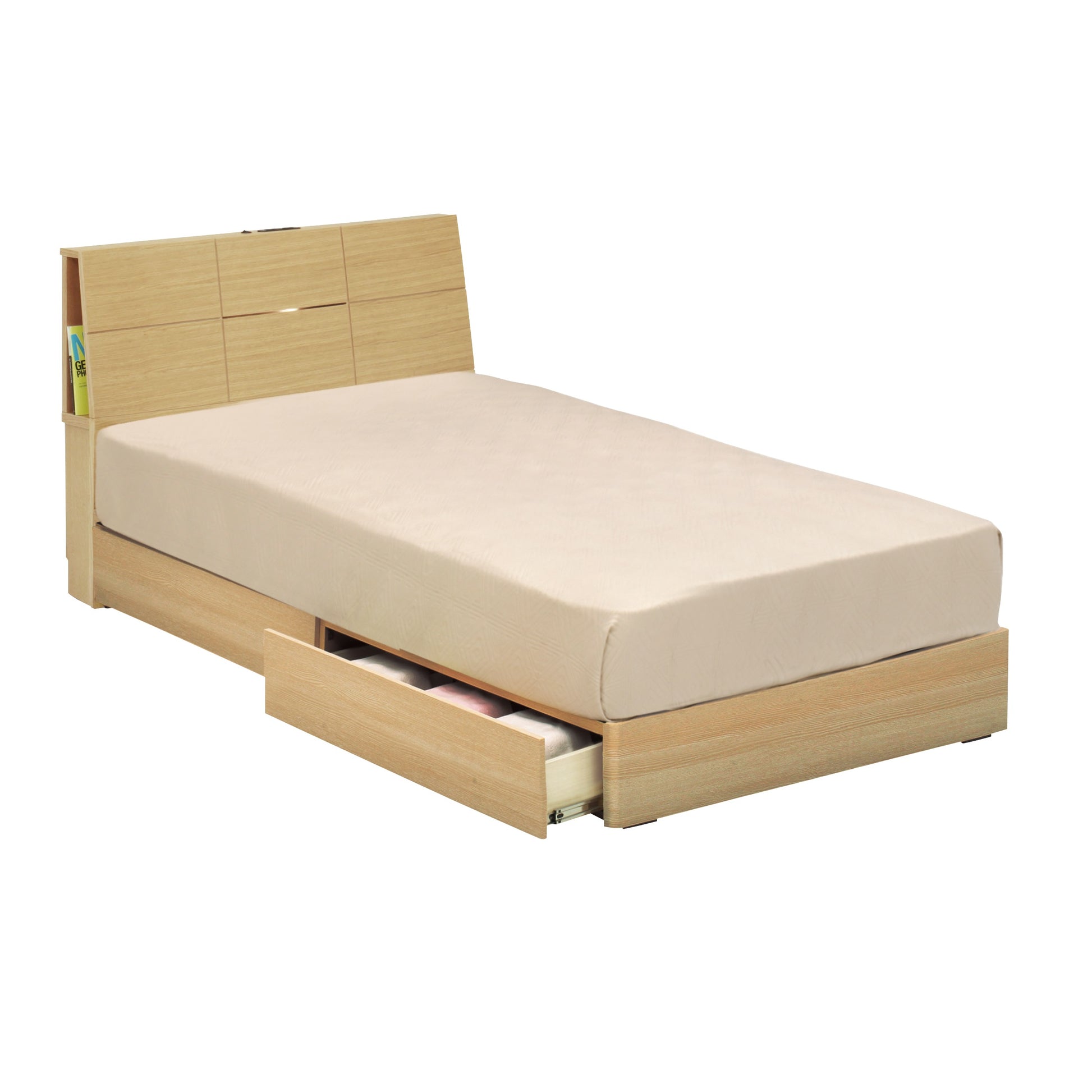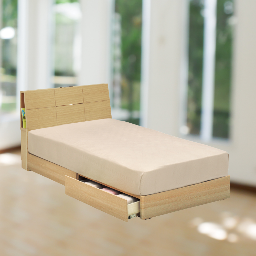 [シングル]棚付き引出付きライト付きベッドフレーム 美しい曲線と木目が一日の疲れを癒します!色違いあり